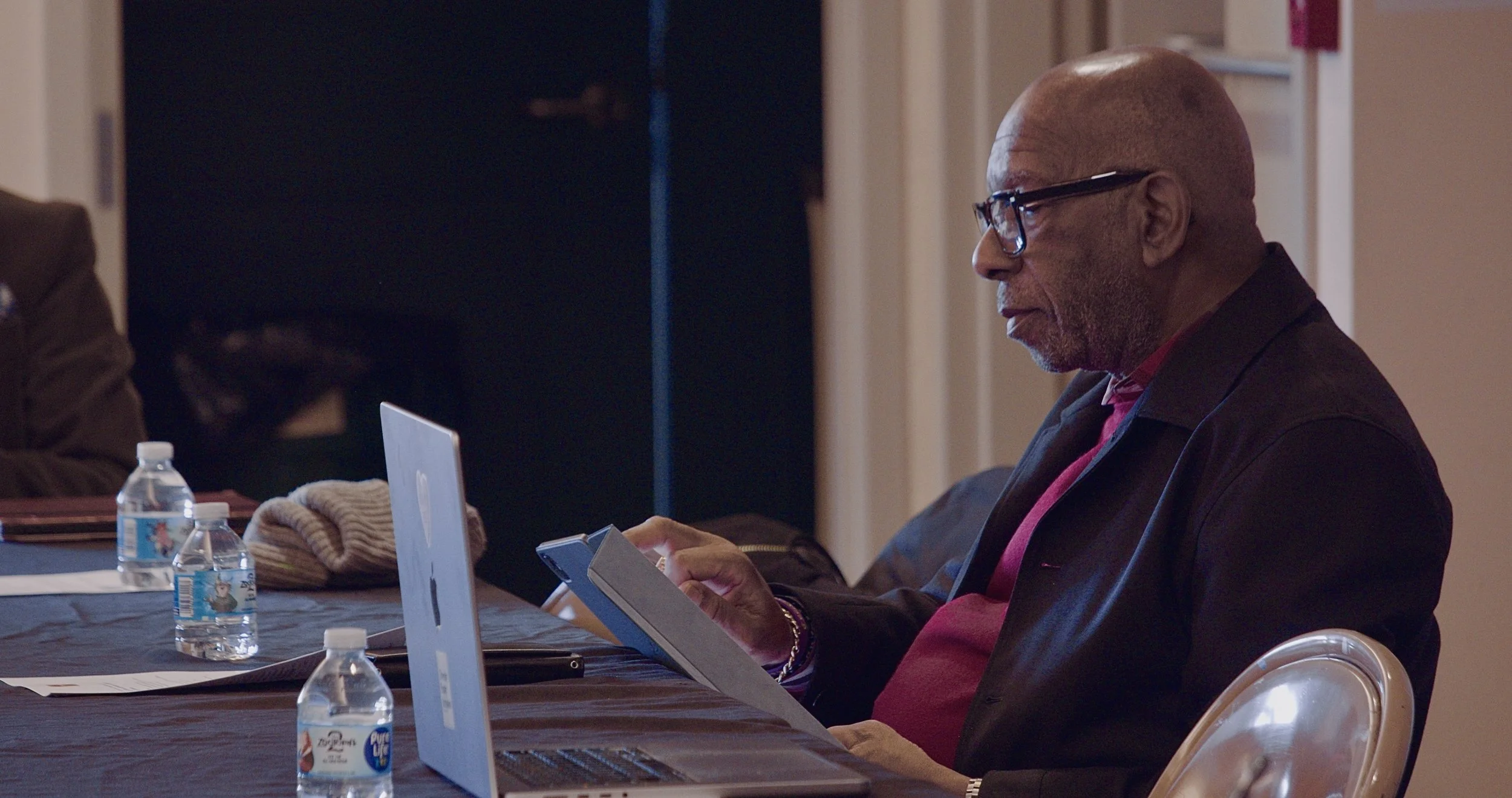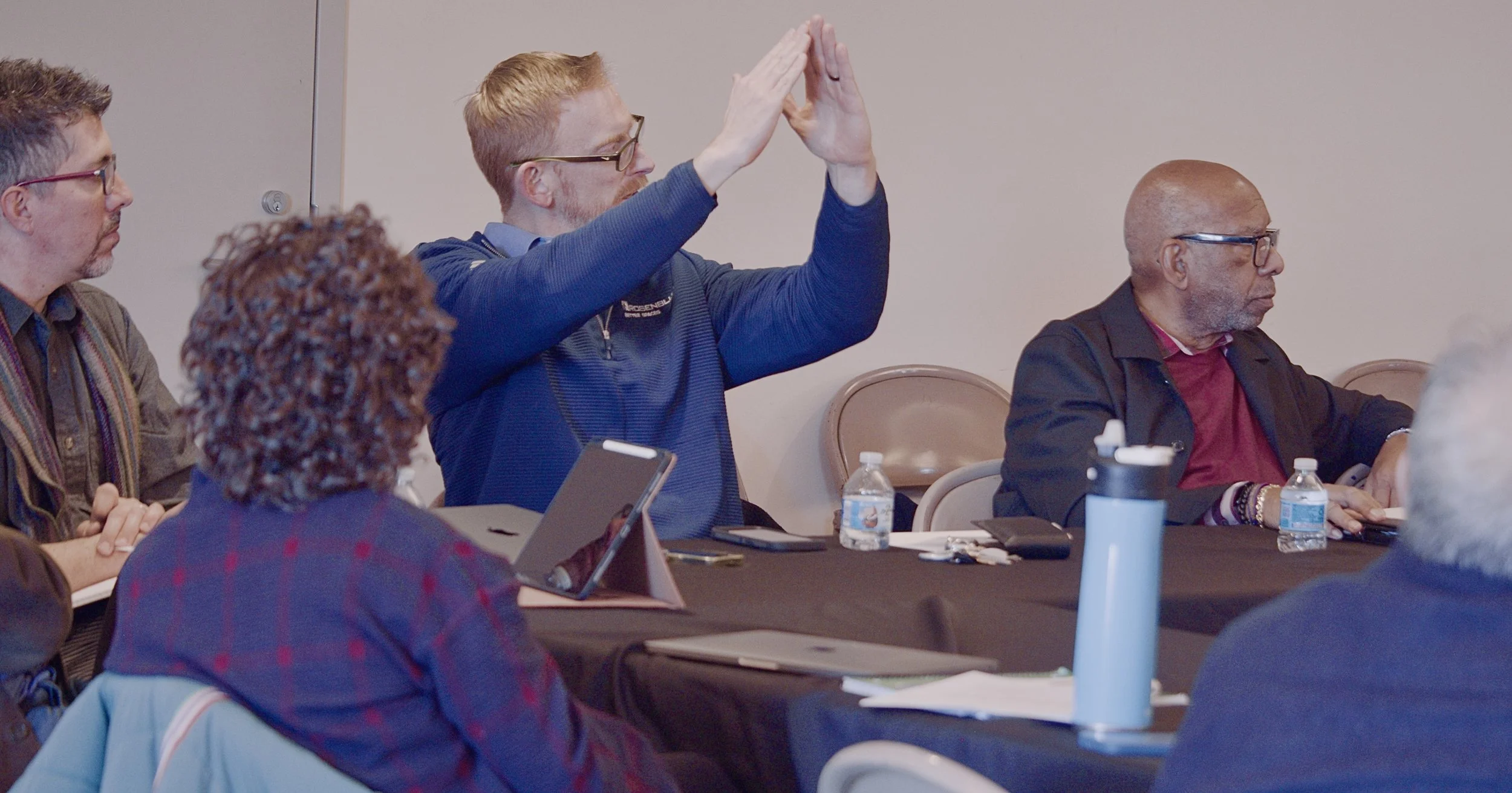 Committee member Bill Chalmers reviews materials during a working session focused on the role of arts and culture in community life and citywide engagement.